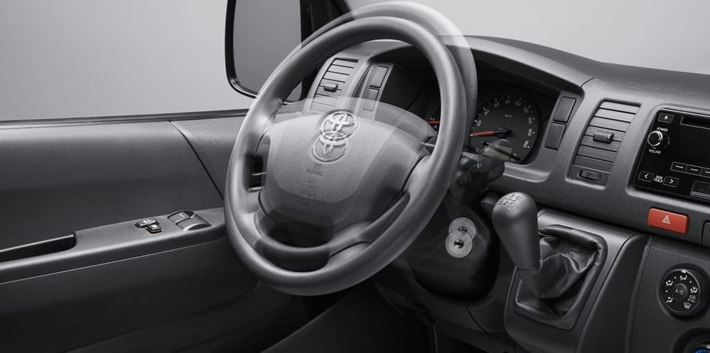 Hiace cuenta con un mecanismo rotativo para prevención que el pedal de freno y la columna de dirección causen daño al piloto ante una colisión frontal.