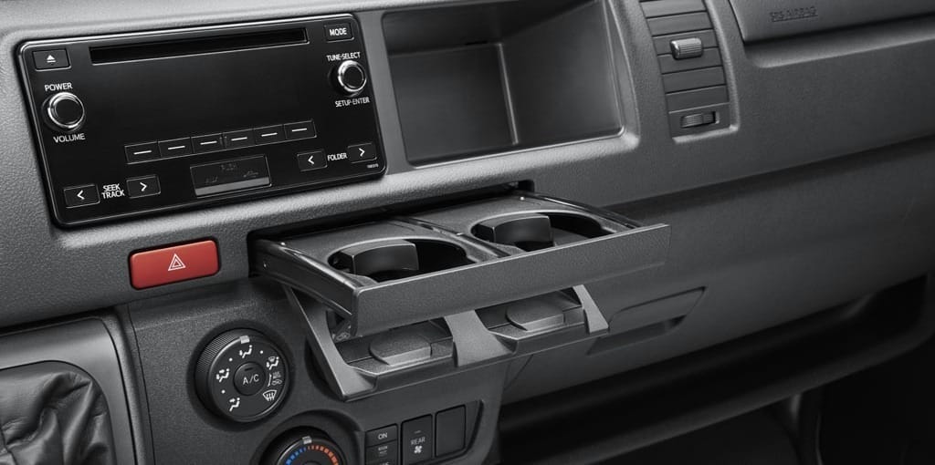 Hiace cuenta con aire acondicionado con controles para fácil manejo con botones opcionales para el aire acondicionado posterior y el desempañador posterior (según cada versión).